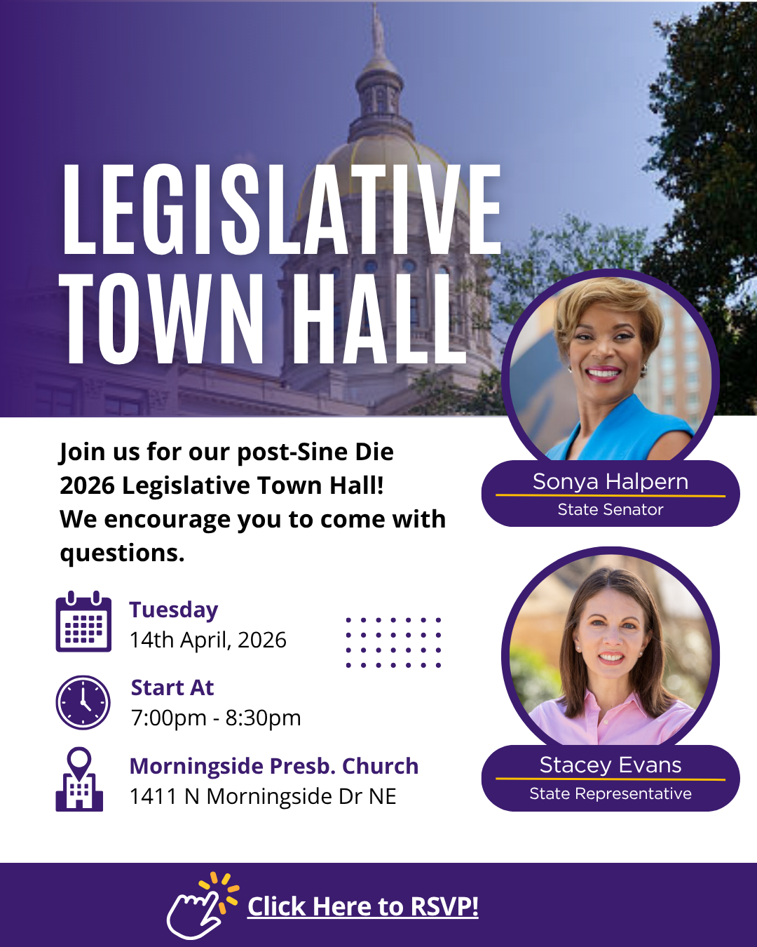 Make sure your calendars are marked for my joint townhall with State Senator Sonya Halpern. We will be giving a summary of what we saw under the Gold Dome this session. We will be holding this Town Hall next Tuesday, April 14th!